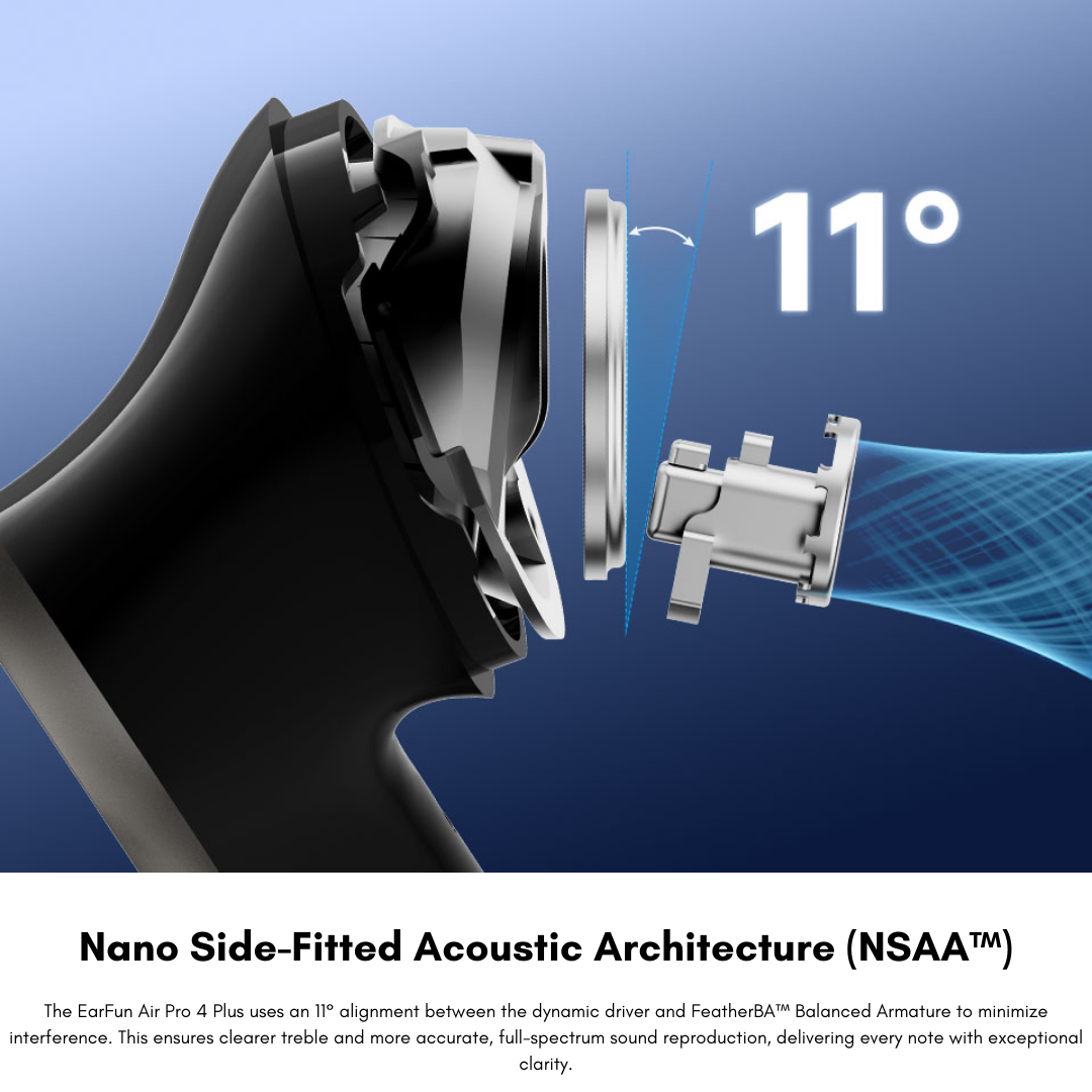 Why choose between sound quality and smart features when you can have both? The EarFun Air Pro 4+ features a rare Dual-Driver Hybrid system—pairing a 10mm dynamic powerhouse with a precision FeatherBA™ armature. The result? Bass you can feel and treble so crisp it feels like a live performance.