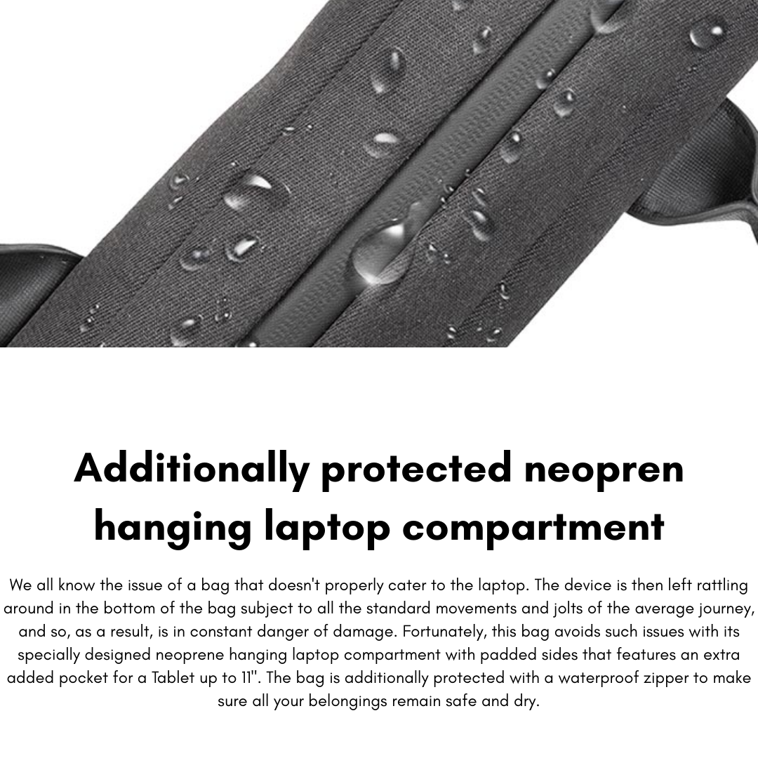 Padded neoprene hanging sleeve fits laptops up to 14” (including MacBook Air 15") and features an additional sleeve for tablets up to 11”. -